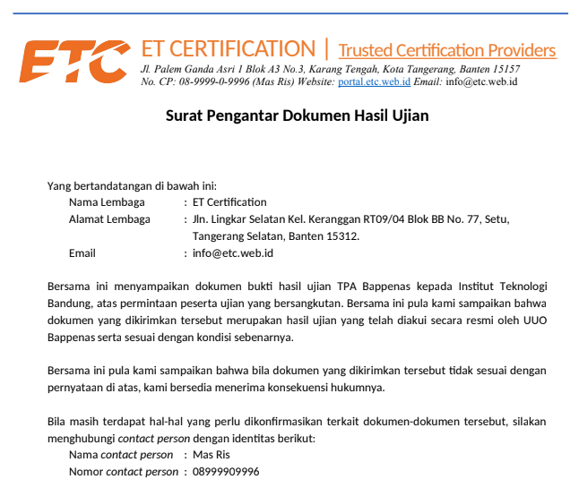 Surat Pengantar ITB (SPI) digunakan untuk keperluan pendaftaran dan proses pelengkapan berkas pendaftaran program pascasarjana tujuan kampus ITB, Peserta akan diminta untuk konfirmasi ke pihak penyelenggara Tes TPA (ET Certification) untuk mengirimkan surat pengantar sertifikat TPA kepada Postgraduate ITB melalui email. Sertifikat hasil wajib dikirimkan langsung oleh lembaga resmi penyelenggara tes ke ITB. Pengiriman dokumen dalam bentuk soft copy tersebut akan kami kirim ke alamat email Postgraduate ITB beserta cc Email ke Peserta apabila diperlukan.