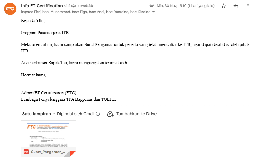 Berikut contoh bukti pengiriman Surat Pengantar Sertifikat TPA Bappenas yang kami kirimkan ke Email ITB: